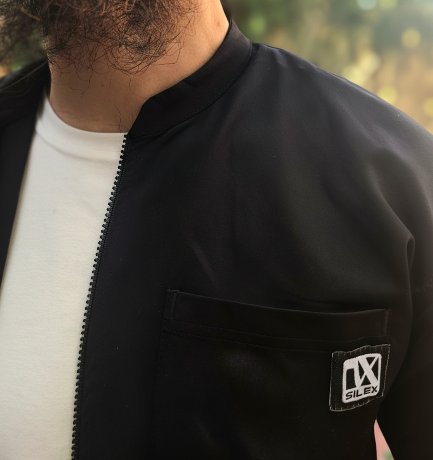 Veste zippée « classique » : Comporte un col court (col officier) et une fermeture éclair sur toute la face avant, avec une poche poitrine fonctionnelle ornée du logo SILEX tissé .